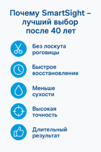После 40 лет лазерная коррекция возможна, но требует индивидуального подхода. SmartSight идеально справляется с миопией и астигматизмом, которые часто сочетаются с пресбиопией.